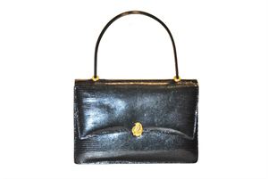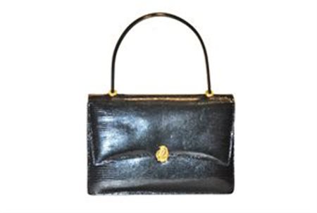 BORSA Borsa artigianale, modello unico, in lucertola nera ad un manico, chiusura a pattina con bottone dorato, due scomparti interni, anni '60 H cm 16 BAG 1960's Handmade one of a kind black lizard handbag with, two internal compartments, flap closureand golden button. Height cm 16