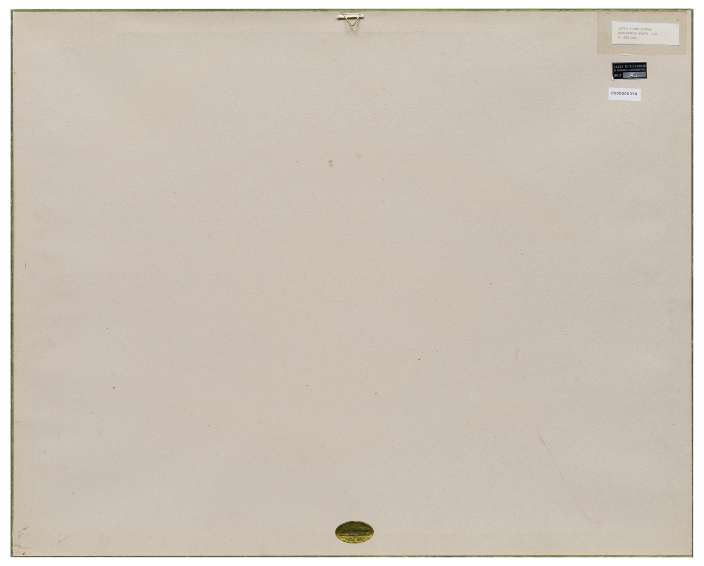 Elementi distintivi: due etichette con riferimenti di inventario, una della Cassa di Risparmio di Fabriano e Cupramontana e l’altra anonima; etichetta anonima con riferimento all’opera ed etichetta della Corniceria Laurenzi, Fabriano