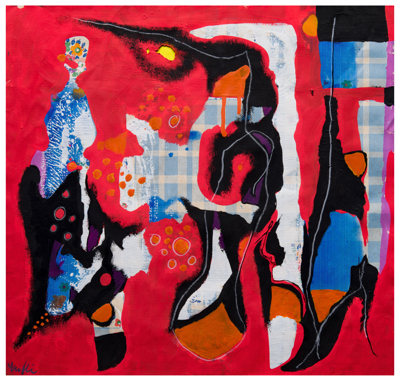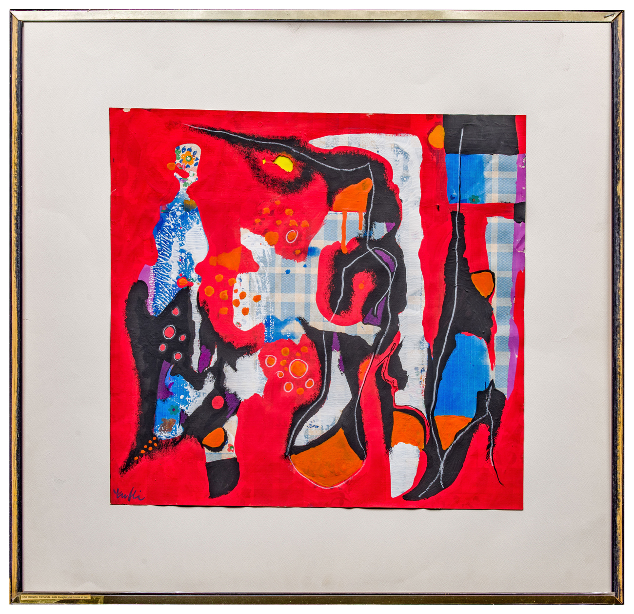 Tempera, gesso, matita e collage su carta con sfondo serigrafico
