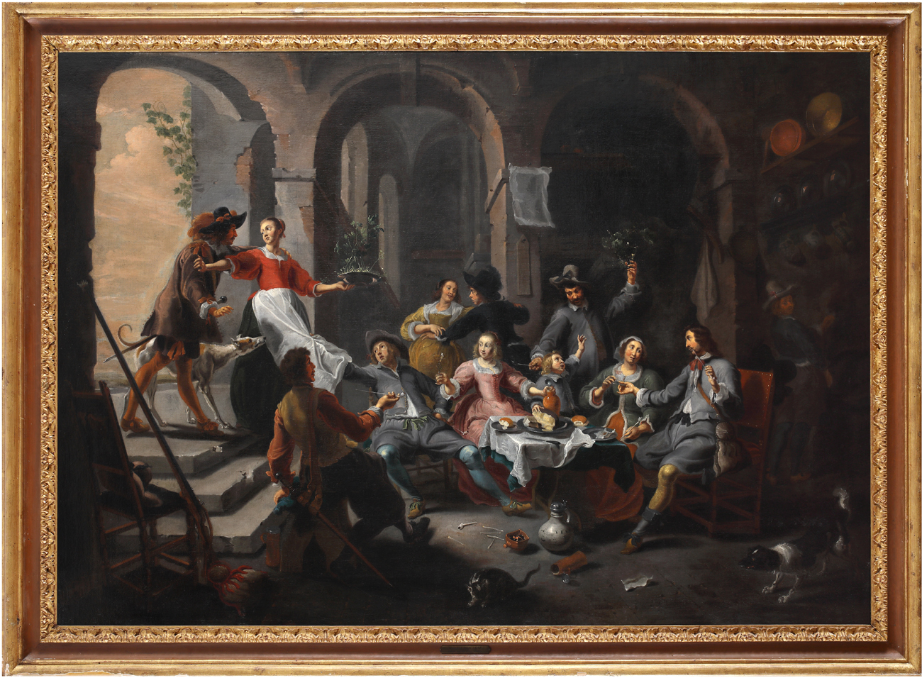 La tela in esame raffigura uno dei suoi soggetti più fortunati, la “Allegoria dei cinque sensi”, qui tradotta in una vivace scena di osteria. Ogni personaggio, o gruppo di figure, incarna uno dei sensi: gli scambi di sguardi alludono alla vista; l’uomo che tira la veste alla cameriera e la coppia sullo sfondo al tatto; il cane a sinistra all’olfatto; i commensali alla tavola al gusto; il bambino che richiama l’attenzione dell’adulto all’udito. La composizione, estremamente riuscita nel suo impianto teatrale, si inserisce nella tradizione secentesca dell’ambientazione in interno, testimoniata, ad esempio, anche da Gregorio e Mattia Preti nella tela di analogo soggetto conservata a Palazzo Barberini, e da Pietro Paolini nella tela conservata al Walters Art Museum, di Baltimora.