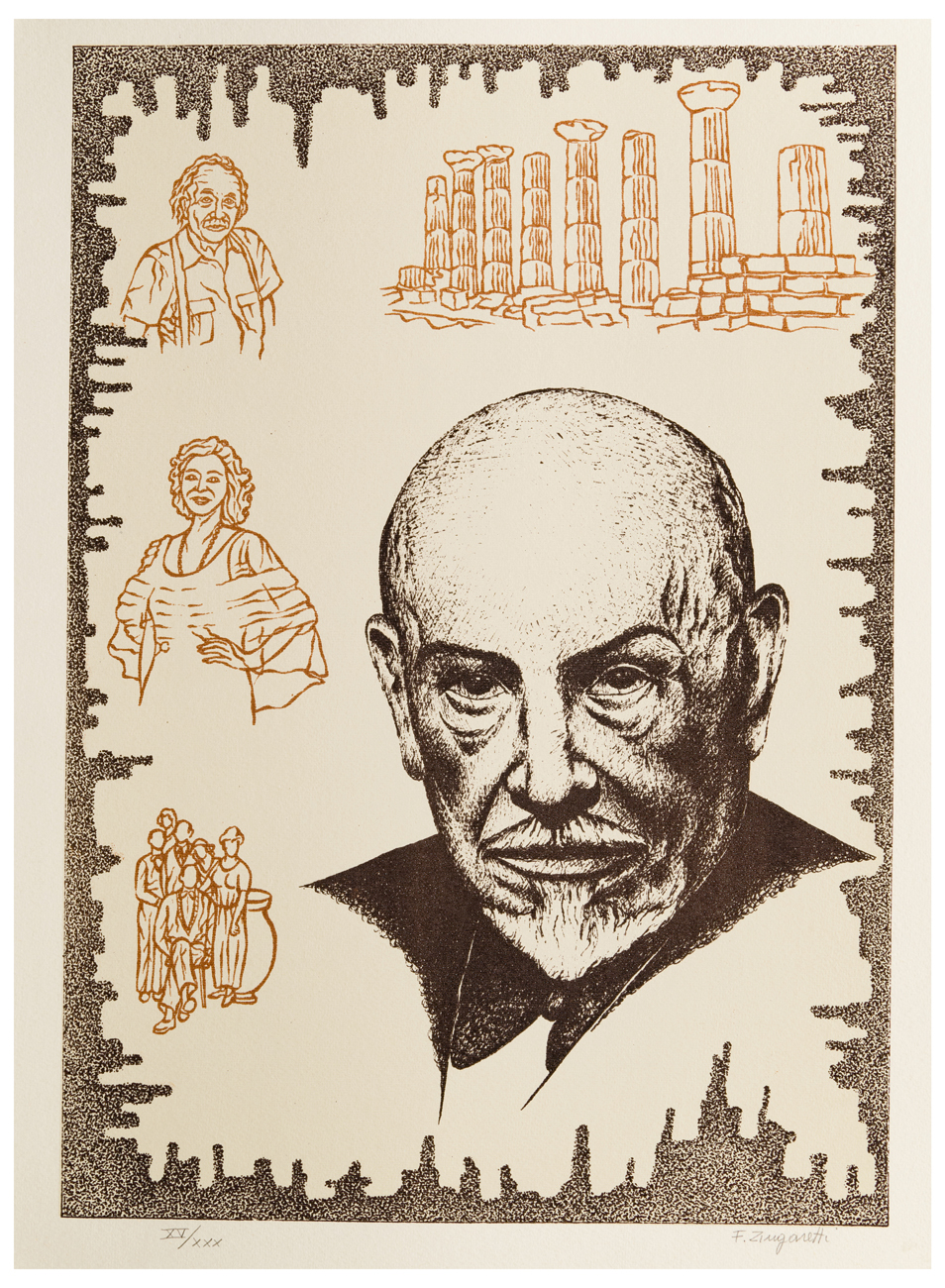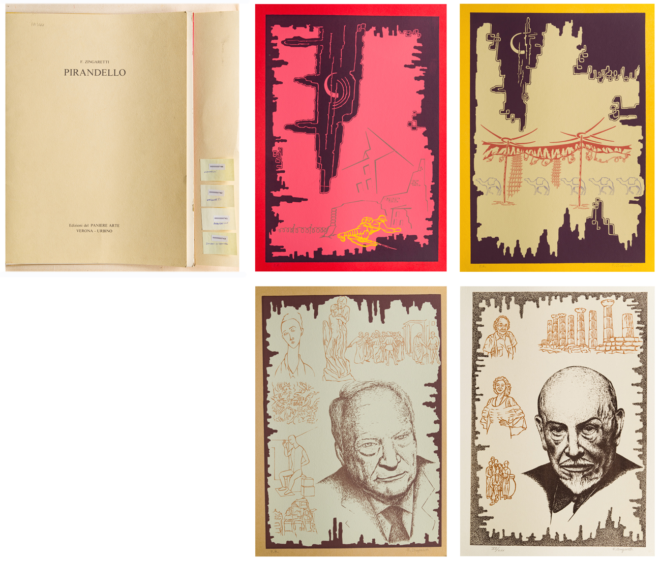 Le quattro serigrafie in asta sono raccolte in una cartella dedicata a Pirandello, e raffigurano, oltre al grande scrittore siciliano, Ungaretti, dei soldati in trincea e dei cammelli.