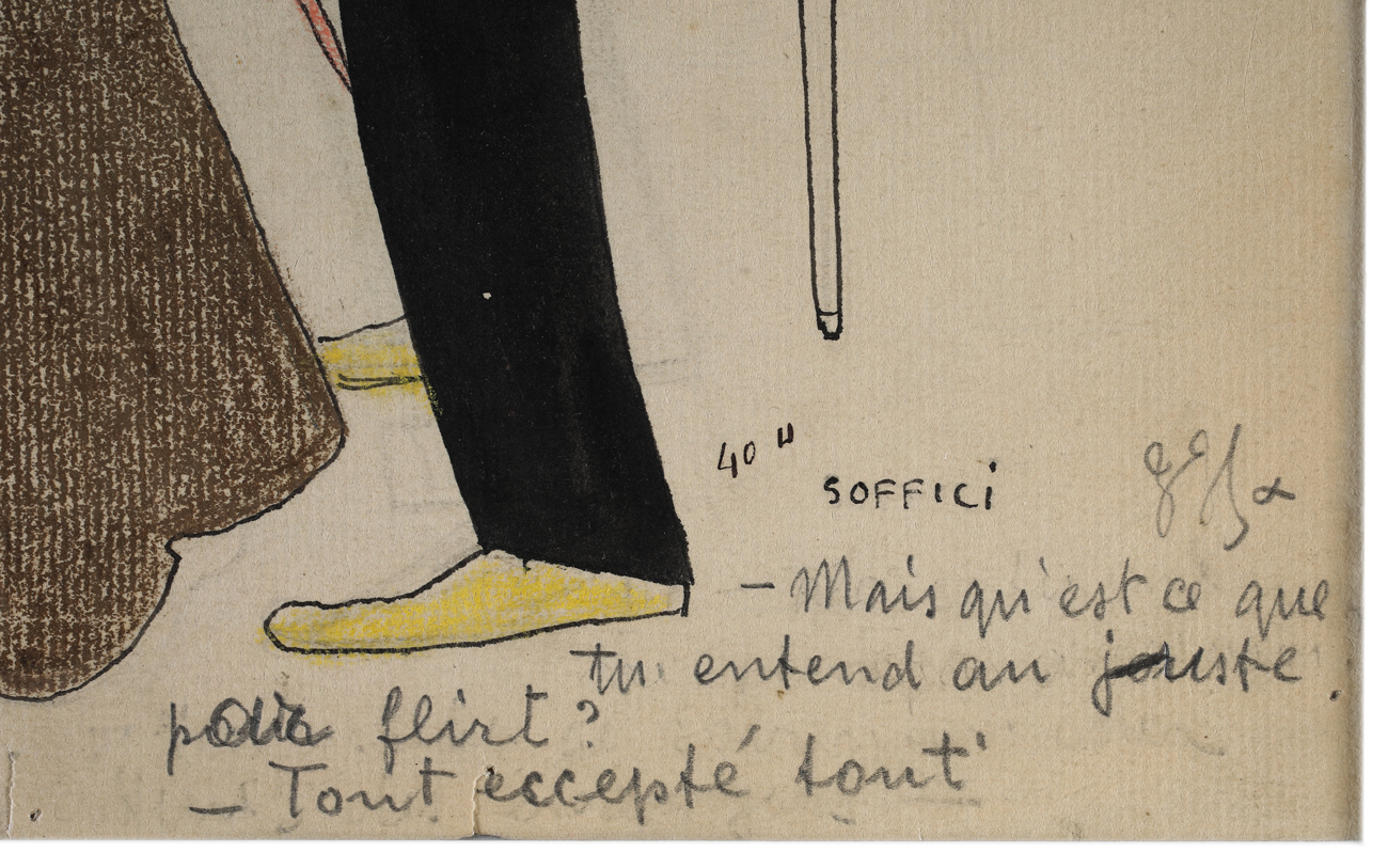 Nasce forse come una illustrazione satirica il cui senso è dichiarato nell'appunto a matita, la battuta secca e spiritosa nel puro stile di Soffici: "Mais qu’est-ce que tu entends au juste par flirt ? Tout, excepté tout" ("Ma cosa intendi esattamente per flirt? Tutto, tranne tutto"). Si noti che l'autore fa un piccolo errore di scrittura nella parola "juste", il che suggerisce le difficoltà linguistiche del giovane italiano alle prese con la nuova lingua.