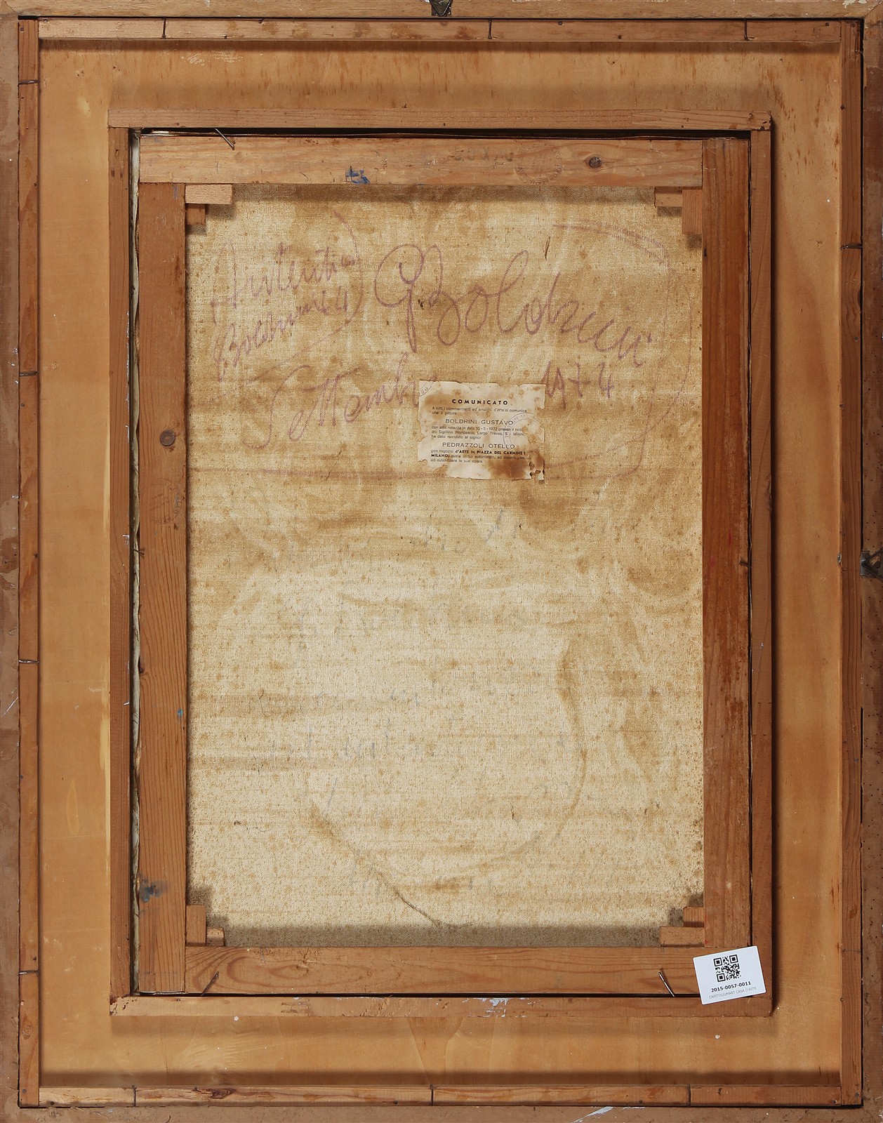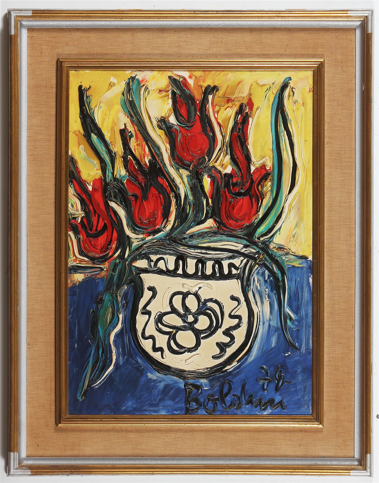 BOLDRINI GUSTAVO (1927 - 1987) Natura morta con vaso. 1974. Olio su tela . Cm 70,00 x 50,00. Firma e anno in basso a destra. Al retro firma per autentica e anno. Cornice presente