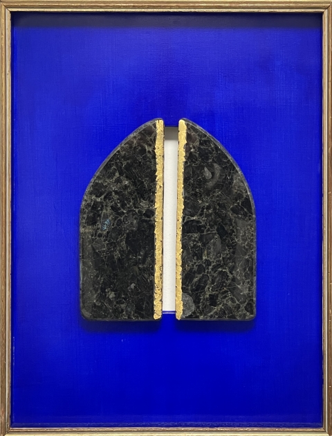 “Sculpture’s Frame XXVI (Portal)”, 2024, granito Volga e foglia d'oro su acrilico blu oltremare su pannello telato,