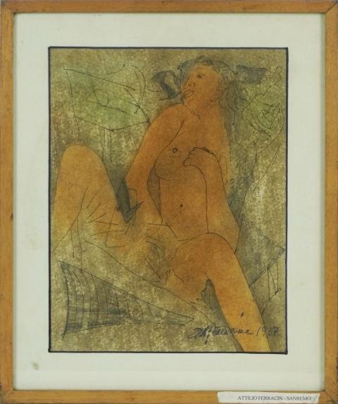 Attilio Ferracin, Dipinto, 20° secolo, Tecnica mista su carta, "Nudo", 1937...
