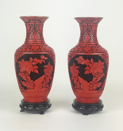 Coppia di vasi autentici laccati al cinabro, 20° secolo,