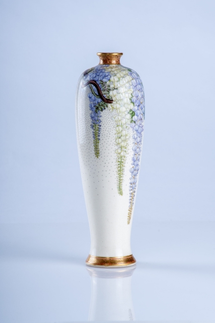 Raffinato vaso slanciato in ceramica decorato con smalti policromi e oro zecchino, con motivi floreali raffiguranti una cascata di glicini in fiore in vari colori. La firma Kinkozan Sobei è decorata in oro zecchino sotto la base.