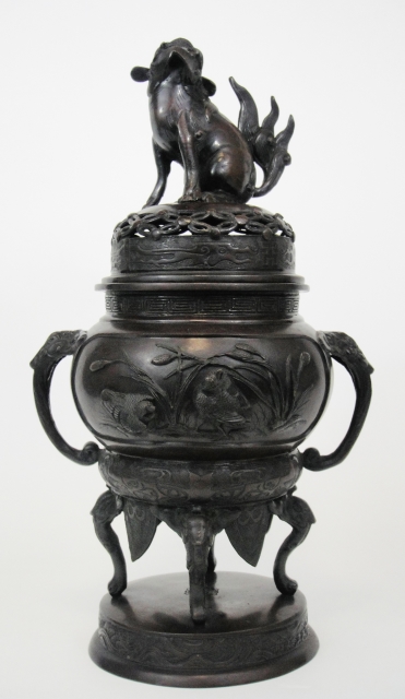 Splendido antico brucia incenso giapponese in bronzo, riccamente decorato, con cane di Foo.
