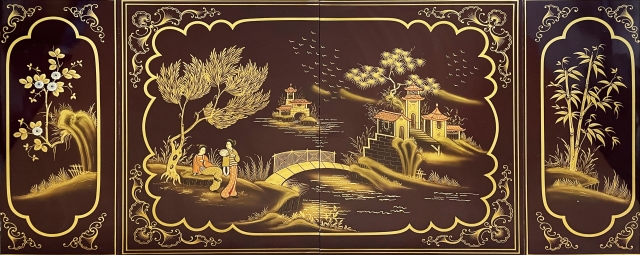 Dipinto ottenuto dall'assemblaggio di tre parti in legno di un antico mobile cinese, laccato in rosso con decorazioni dorate, presumibilmente risalente alla metà del XX secolo.