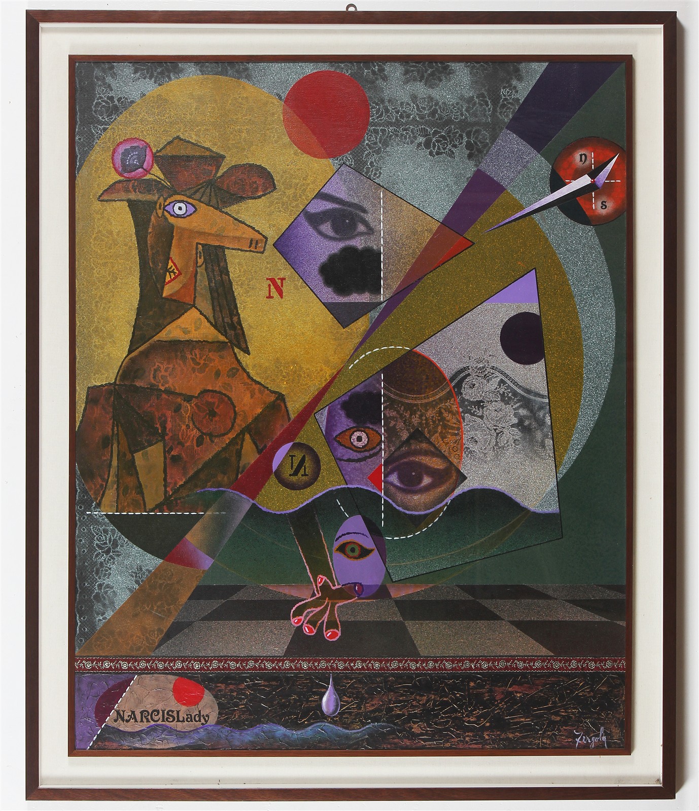 FERGOLA SERGIO (1936 - 1994) Narcis-Lady. Acrilico su tela. Cm 80,00 x 100,00. Firmato in basso a destra. Autentica dell'artista su fotografia datata 1/1/93. . Cornice presente