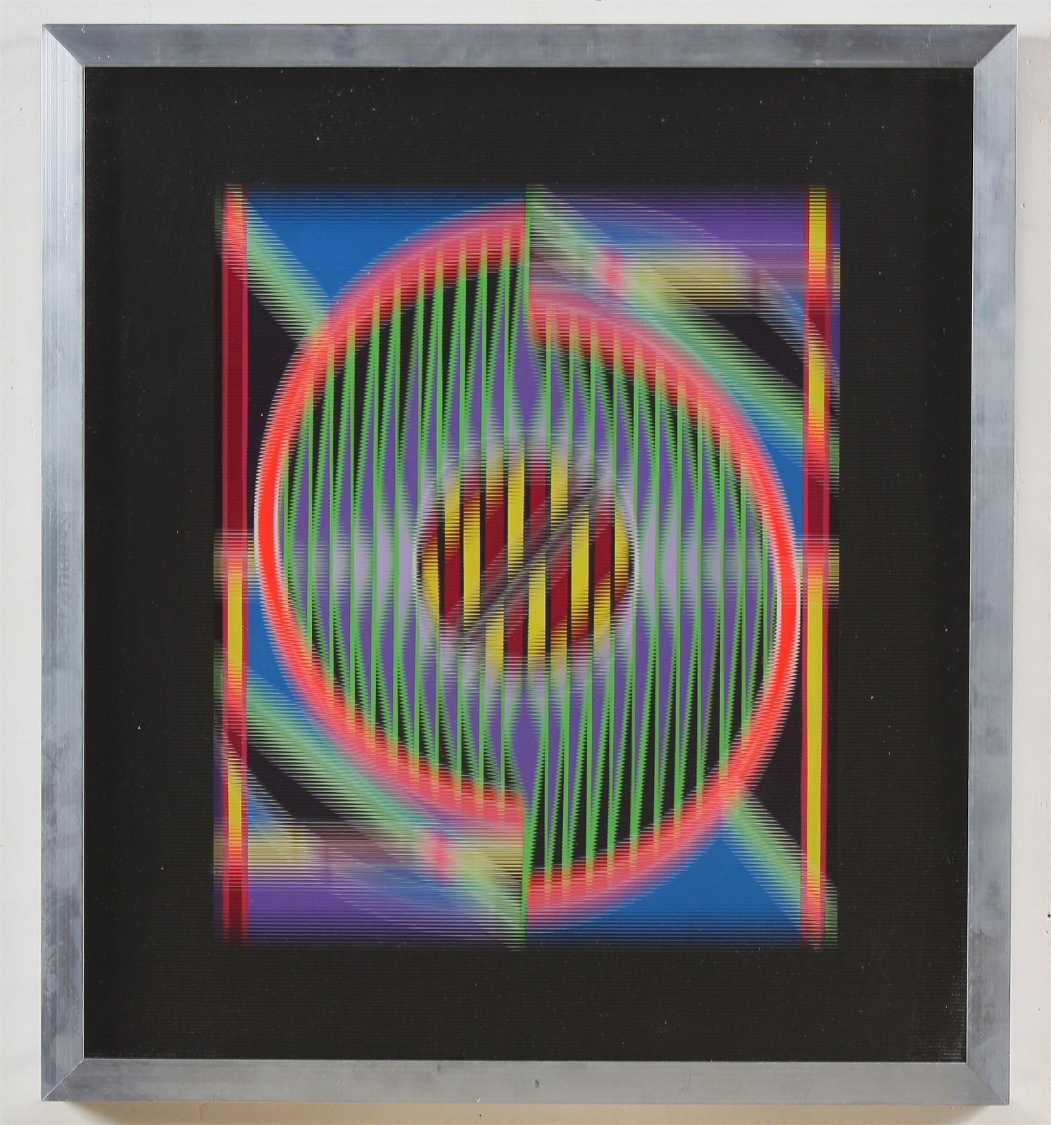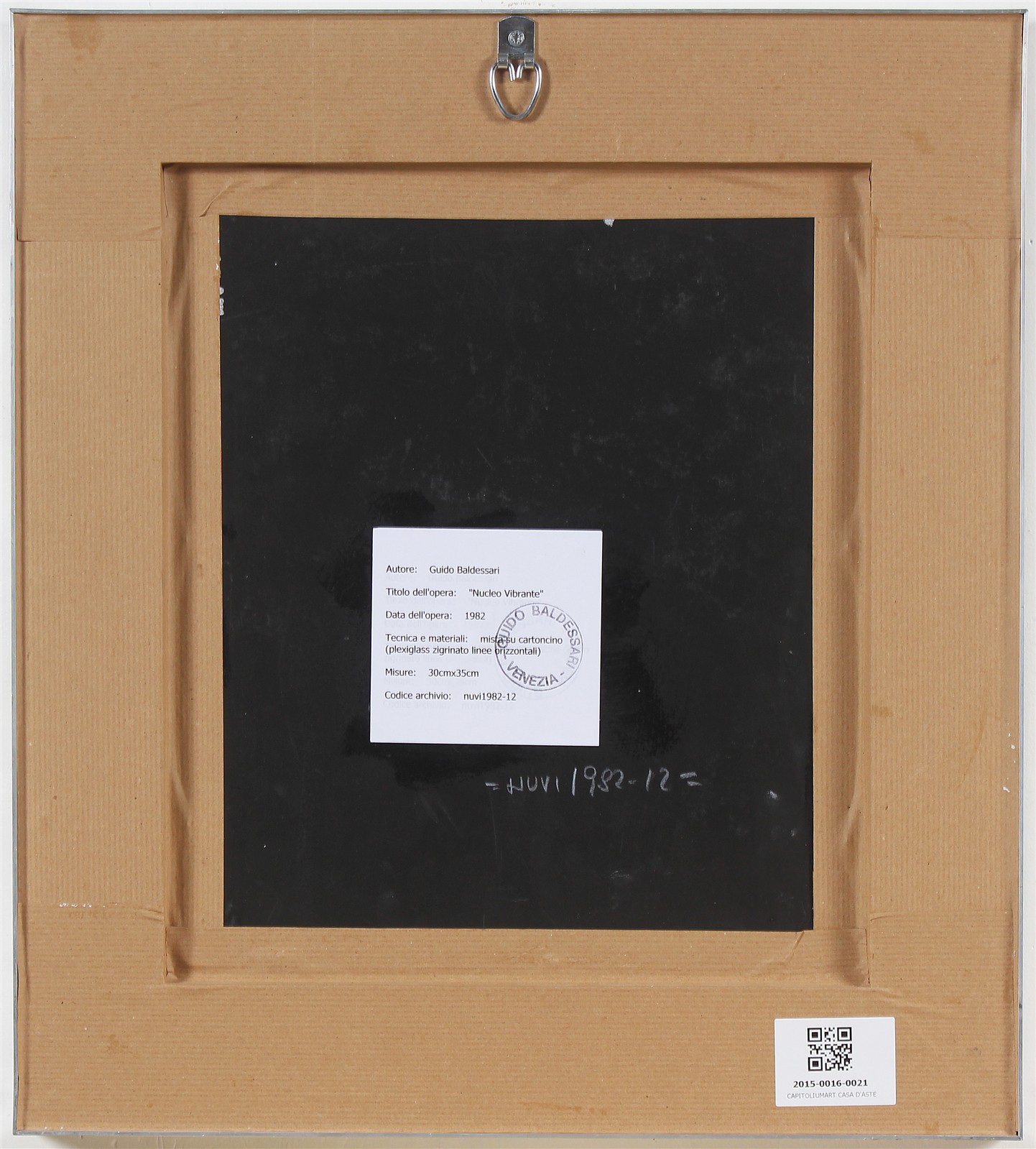 BALDESSARI GUIDO (n. 1938) Nucleo vibrante. 1982. Tecnica mista su cartoncino. Cm 35,00 x 30,00. Plexiglass zigrinato a linee orizzontali. Al retro reca il cartiglio dell'artista. Autentica dell'artista e timbro della galleria Anti: su fotografia. Cornice presente