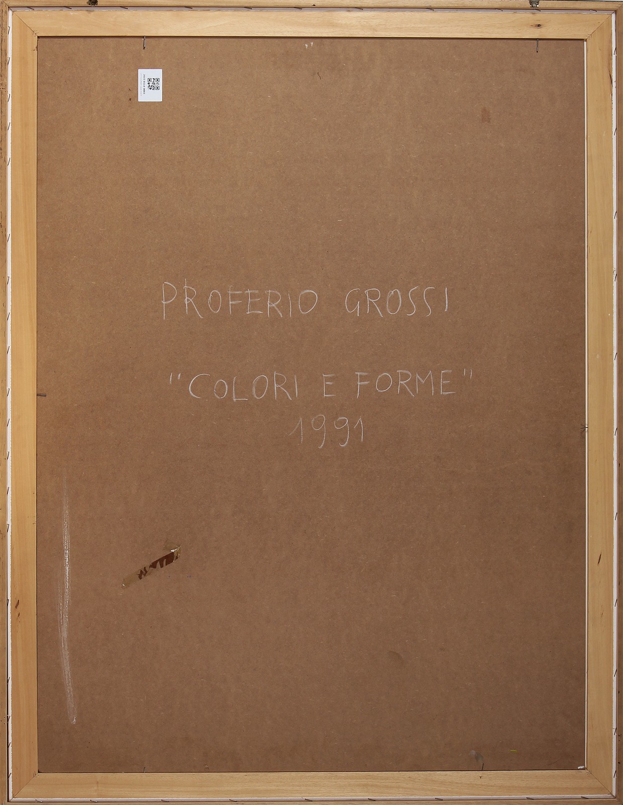 GROSSI PROFERIO (1923 - 2000) Colori e forme. 1991. Olio su masonite. Cm 120,00 x 90,00. Firma e anno in basso a destra. Al retro titolo, firma e anno. Cornice presente