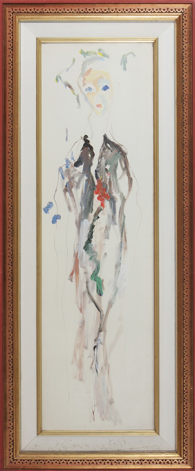 TRECCANI ERNESTO (1920 - 2009) Donna. Olio su tela . Cm 35,00 x 120,00. Firma in basso a destra. Autentica dell' artista du fotografia. Cornice presente