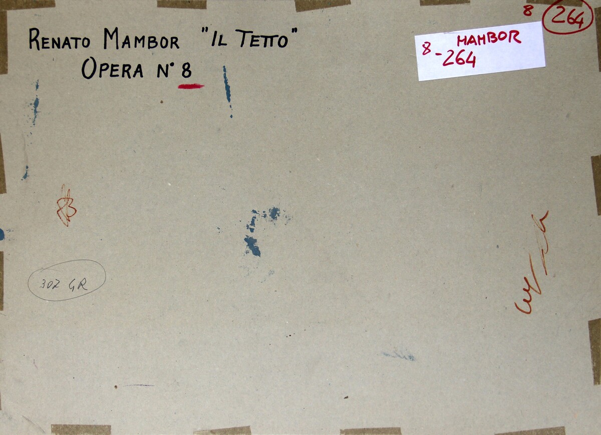 Firma, titolo, scritta "Renato Mambor Il tetto Opera n. 8" (al retro)