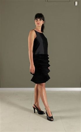 MILA SCHON Splendido abito da sera nero, tubino smanicato, tagliato sotto il seno, con sei balze orizzontali a crescere dal punto vita all'orlo, anni '90 Tg. 38 MILA SCHON 1990's black sleeveless short umpire style evening dress with 6 flounced tiers Italian size:38