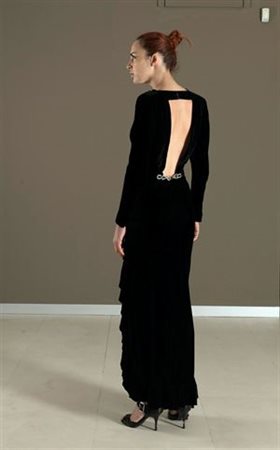 ABITO SARTORIALE Abito lungo in velluto nero con scollo sulla schiena, ruche...