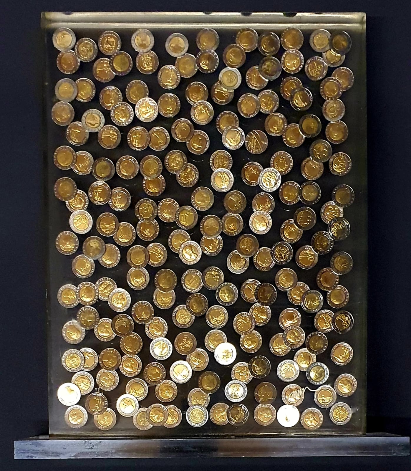 Assemblage di monete, resina e poliestere, cm 45x35,5x5