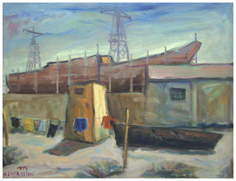 ALFREDO CATARSINI Viareggio 1899 – Viareggio 1993 Senza titolo (Cantiere n.2) 1954 Olio su tela 48,5 x 60. Data e firma in b. a s.; sul verso etichetta “Estate 1954 – Bagni di Lucca” + etichetta VI Premio Michetti, Francavilla a Mare.