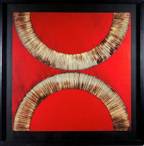 fiammiferi bruciati su tavola rossa, cm 70×70