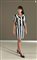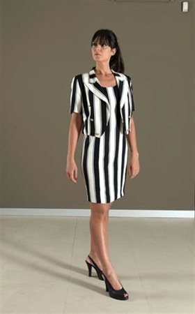 MOSCHINO CHEAP AND CHIC Tailleur composto da abito tubino a manica corta e giacchina a vita, a righe bianco nere verticali di cm. 4, bottoni dorati, anni '80 tg. M MOSCHINO CHEAP AND CHIC 1980's black and white vertical striped suit composed of short sleeved dress and cropped short sleeved jacket with gold buttons size: M