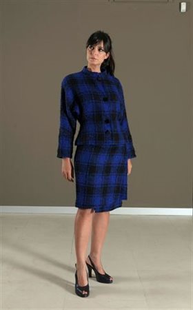 ENRICO COVERI Tailleur composto da giacca e gonna bluette e nero a quadri grandi in bronchè, collo alla coreana e quattro bottoni, manica reglan, anni '80 tg. M ENRICO COVERI 1980's blue and black plaid suit composed of 4 buttoned, raglan sleeved jacket with nehru collar and skirt size: M