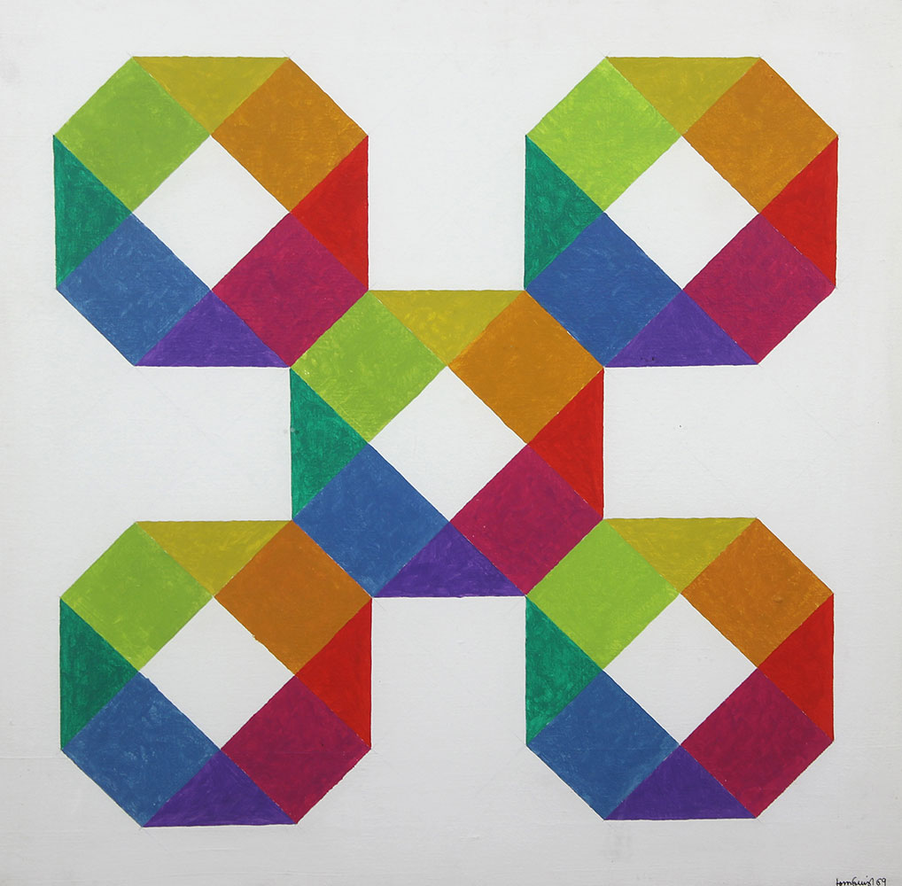 Tornquist Jorrit Composizioni, 1969 acrilico su tela, cm. 60x60 firmato e datato in basso a destra e al retro, etichetta dello Studio f.22 Modern Art Gallery di Palazzolo sull'Oglio al retro, certificazione di autenticità firmata "Pagani" al retro