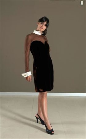VALENTINO BOUTIQUE Abito in velluto color bronzo con maniche, scollo, schiena in organza colore marrone, collettino e polsini in seta color panna, anni '80 tg. M VALENTINO BOUTIQUE 1980's bronze velvet dress with sheer organza top, sleeves and back with cream colored satin collar and cuffs size: M