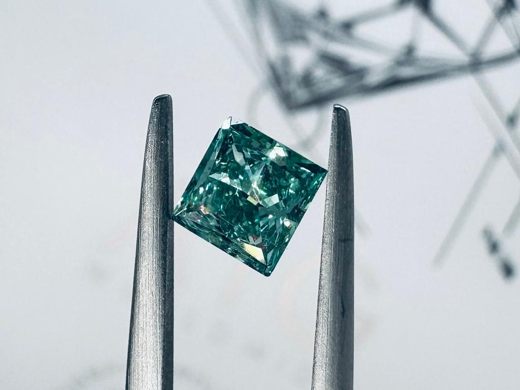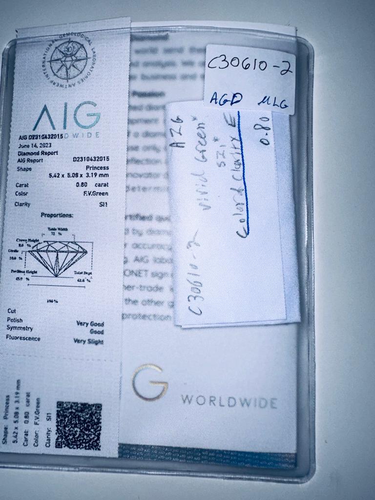 DIAMANTE NATURAL POLISHED 0,8 - COLORE FANCY VERDE VIVIDO - PUREZZA SI1 - (COLORE E PUREZZA ESALTATI) - CERTIFICATO AIG NUMERO DI REPORT INCISO AL LASER SULLA CORONA - C30610-2 - COMMISSIONE D’ASTA 25%