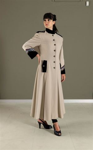 OZBEK Cappotto in panno chiaro di stile ussaro, con finiture di velluto nero sulle tasche e sulla manica, anni ' 80 tg. M OZBEK 1980's long , full A-line, light mushroom colored coat with black velvet trim on neck, sleeves and pockets with silver buttons size: M