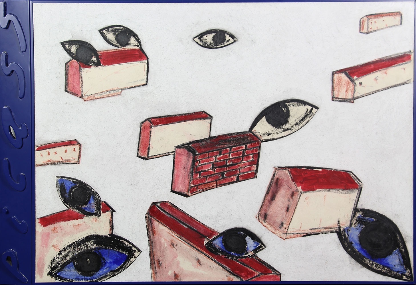 Cucchi Enzo Senza titolo (The Age of Jesus), 1996 tempera, olio e collage su carta applicata su tavola in cornice di metallo dipinto, cm. 76x110 firmato e datato al retro, etichetta Akira Ikeda Gallery di Tokio al retro, certificato di autenticità rilasciato dalla FarsettiArte di Prato