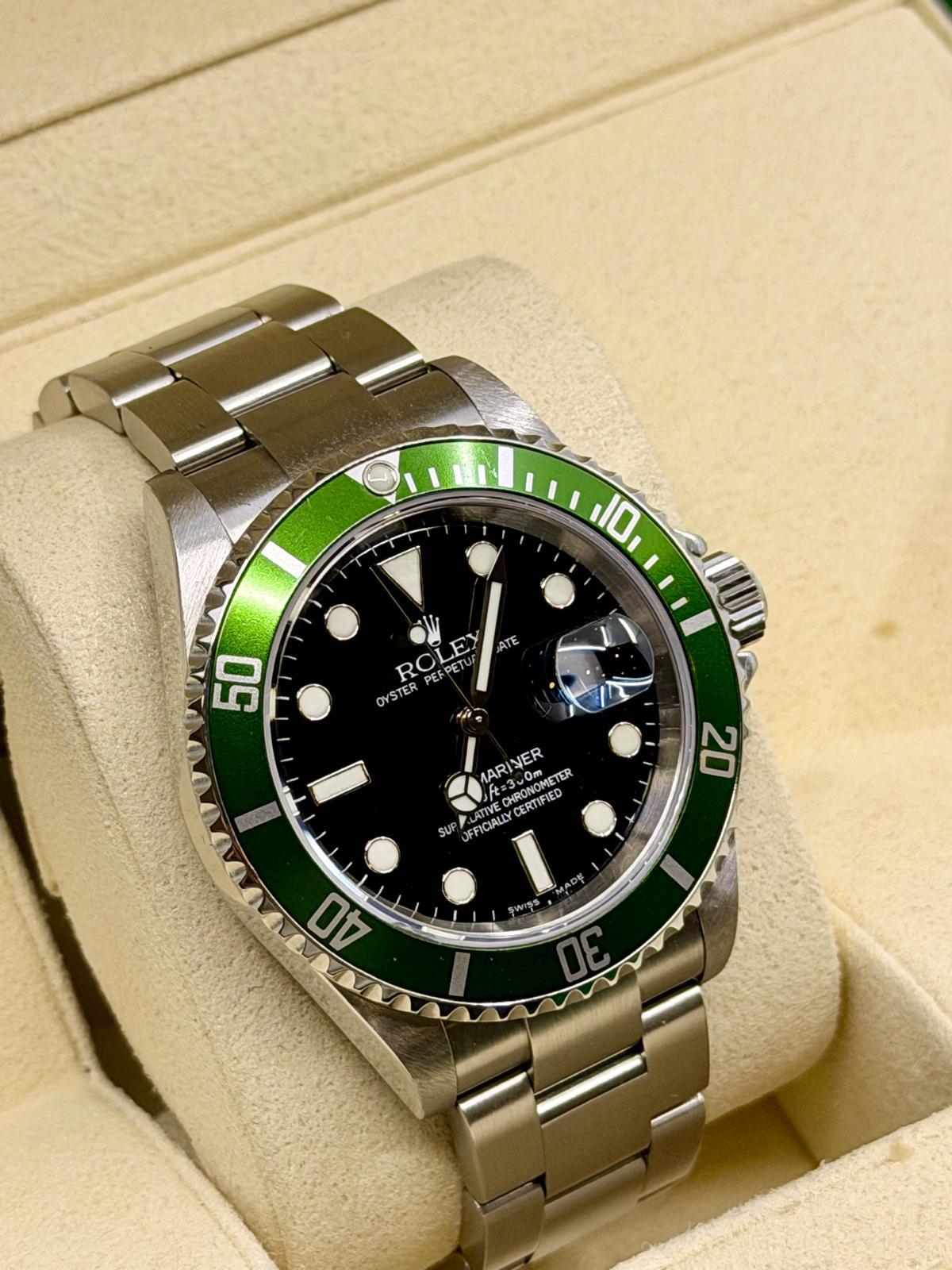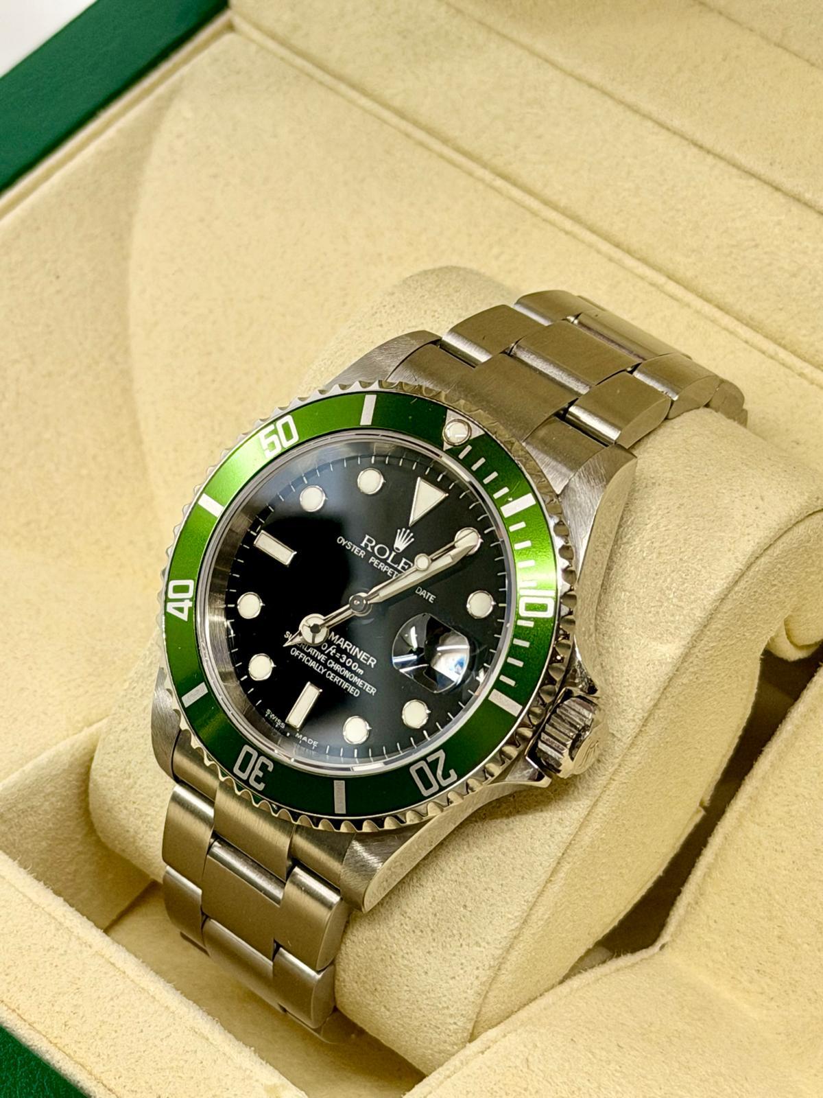 Marca Rolex Modello (Orologio) Submariner kermit Numero di referenza 16610LV Carica Automatico Materiale della cassa Acciaio Materiale cinturino Acciaio Condizione Usato (Ottimo) L'articolo presenta segni di usura lievi, come ad esempio graffi leggeri, ma non percepibili al tatto. documenti originali, no box Materiale della cassa Acciaio Diametro 40 mm Impermeabile 30 ATM Materiale lunetta Acciaio Vetro Vetro zaffiro Quadrante Nero Numeri sul quadrante Senza numeri Cinturino Materiale cinturino Acciaio Colore cinturino Acciaio Chiusura Déployante Materiale chiusura Acciaio Anno 2005 - COMMISSIONE D’ASTA 25%