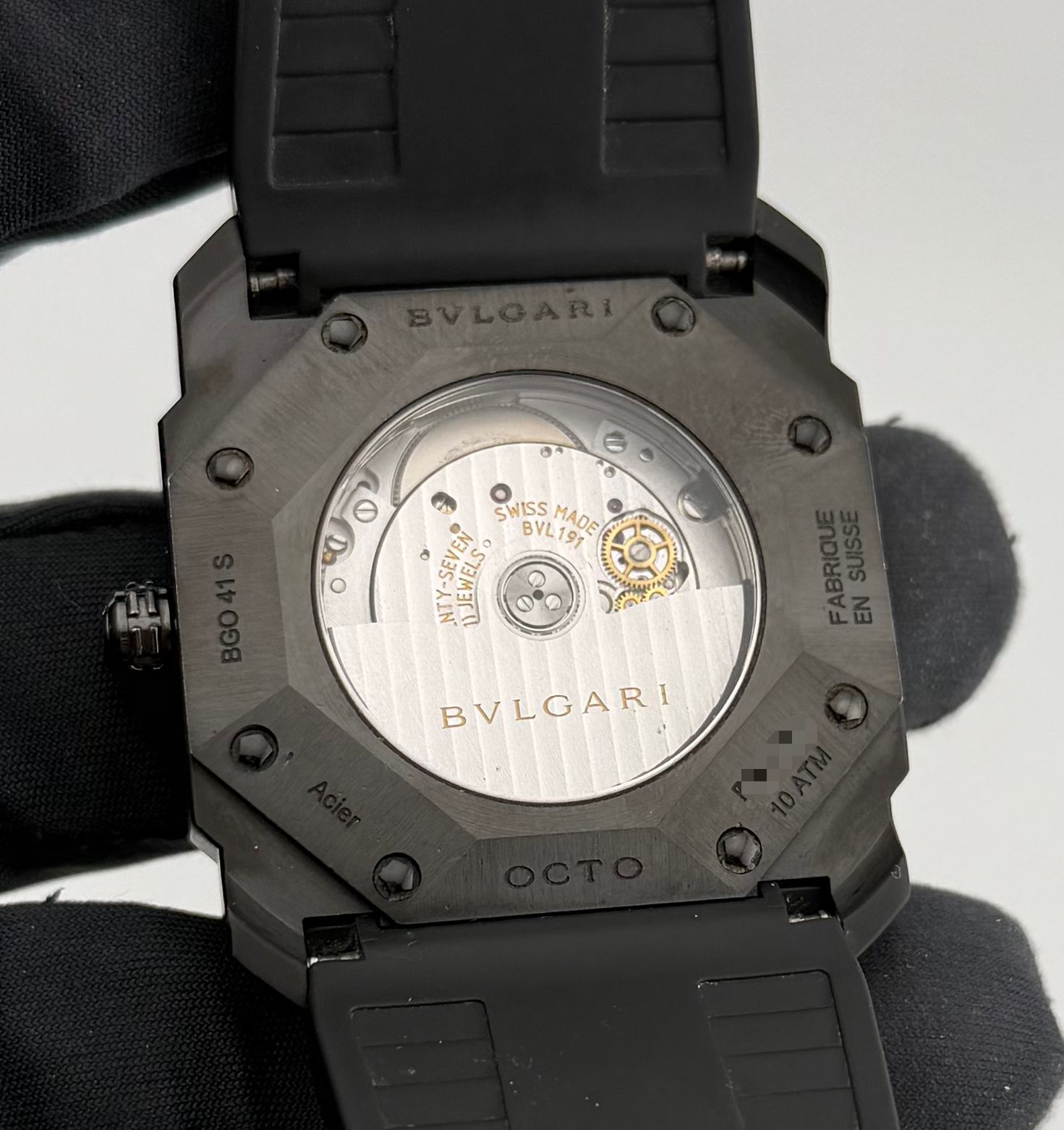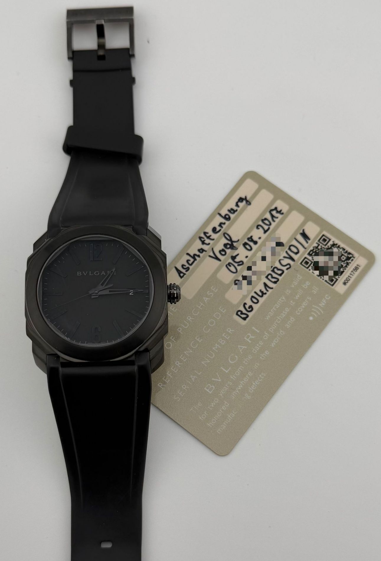 MARCHIO: Bulgari MODELLO: Octo REFERENZA: PO 5798 NUMERO SERIALE: BG04XXXXXXXX MATERIALE CASSA: Acciaio DATA DI ACQUISTO: 05/08/2017 DIAMETRO: 41mm BRACCIALE: Gomma Nero MOVIMENTO: Automatico COLORE QUADRANTE: Nero MATERIALE VETRO: Vetro Zaffiro CORREDO: Garanzia originale Bulgari – No box - COMMISSIONE D’ASTA 25%