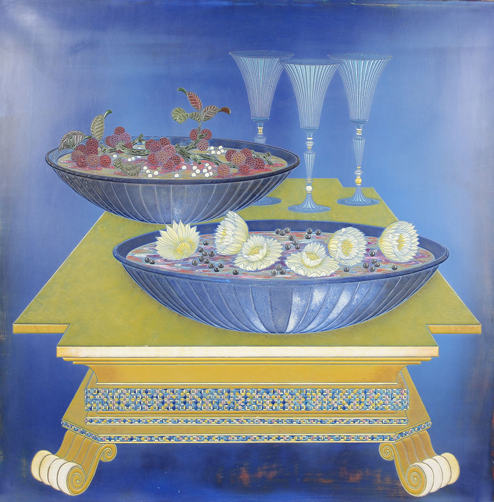Massini Claudio Blu con Coppe Blu encausto su tela, cm. 75x75 firma incisa al retro del telaio, etichetta Galleria Modenarte di Modena al retro, LOTTO PROVENIENTE DA IMPRESA E PERTANTO ASSOGGETTATO AD I.V.A. DEL 22% SUL PREZZO DI AGGIUDICAZIONE