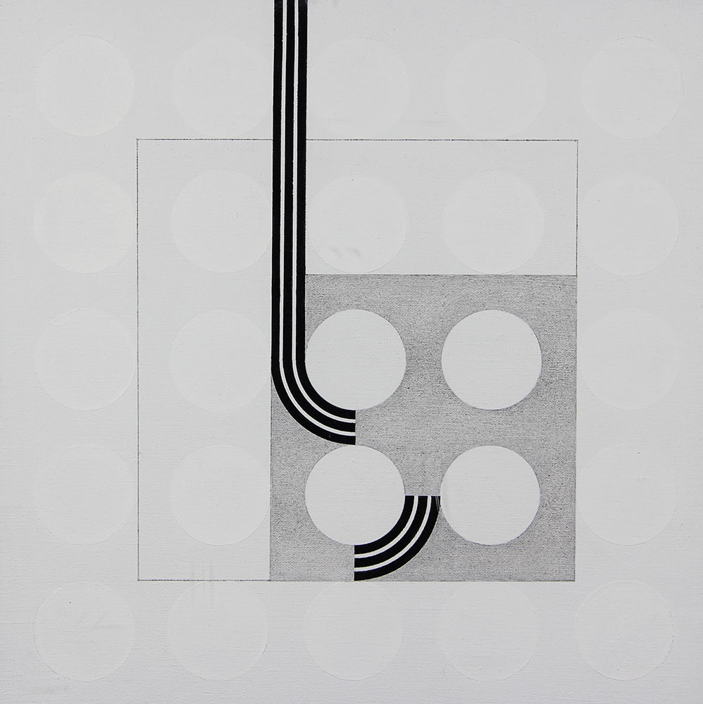 Nangeroni Carlo Mutazione Ritmica, 1973 acrilico su tela, cm. 50x50 firmato e intitolato al retro, etichetta Galleria Gastaldelli Arte Contemporanea di Milano al retro del telaio, etichetta Galleria d'Arte di Bergamo al retro
