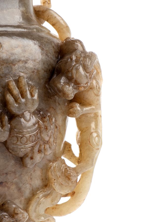 Vaso in giada con coperchio decorato di fenici e manici ad anello.