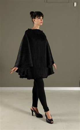 PLEATS PLEASE ISSEY MIYAKE Cappa a semicerchio nera, a piu' strati, pieghettata con leggere ruche finali e tasche inserite a taglio, anni '90 tg. unica PLEATS PLEASE ISSEY MIYAKE 1990's black pleated cape with multi layers, side slanted pockets and ruching on hem one size