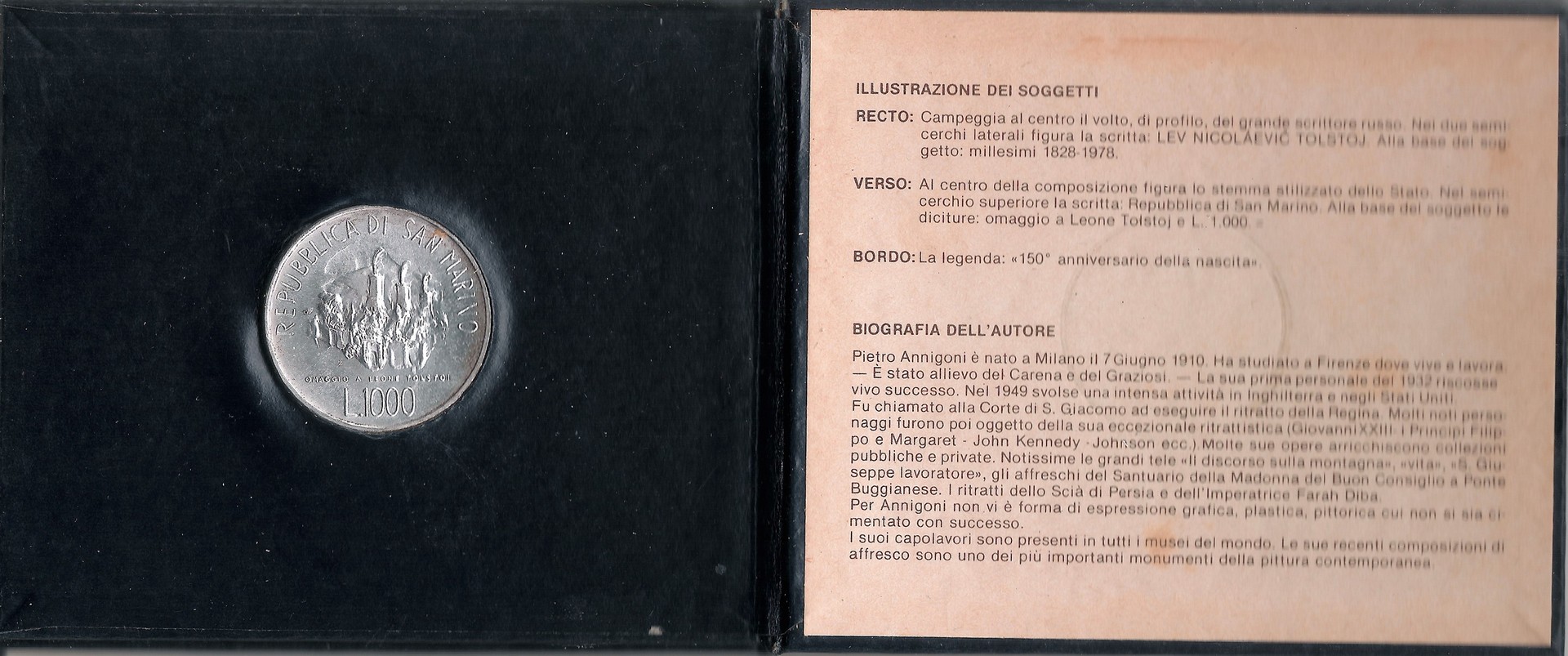 Coniazione Ufficiale di una monete speciale in argento a corso legale da L.1000 Millesimo 1978 commemorativa del 150° anniversario della nascita di Leone Tolstoj, 1978 Titolo legale argento 835% gr. 14,6 diametro mm. 31,4 Repubblica di San Marino Segreteria per le finanze e il Bilancio