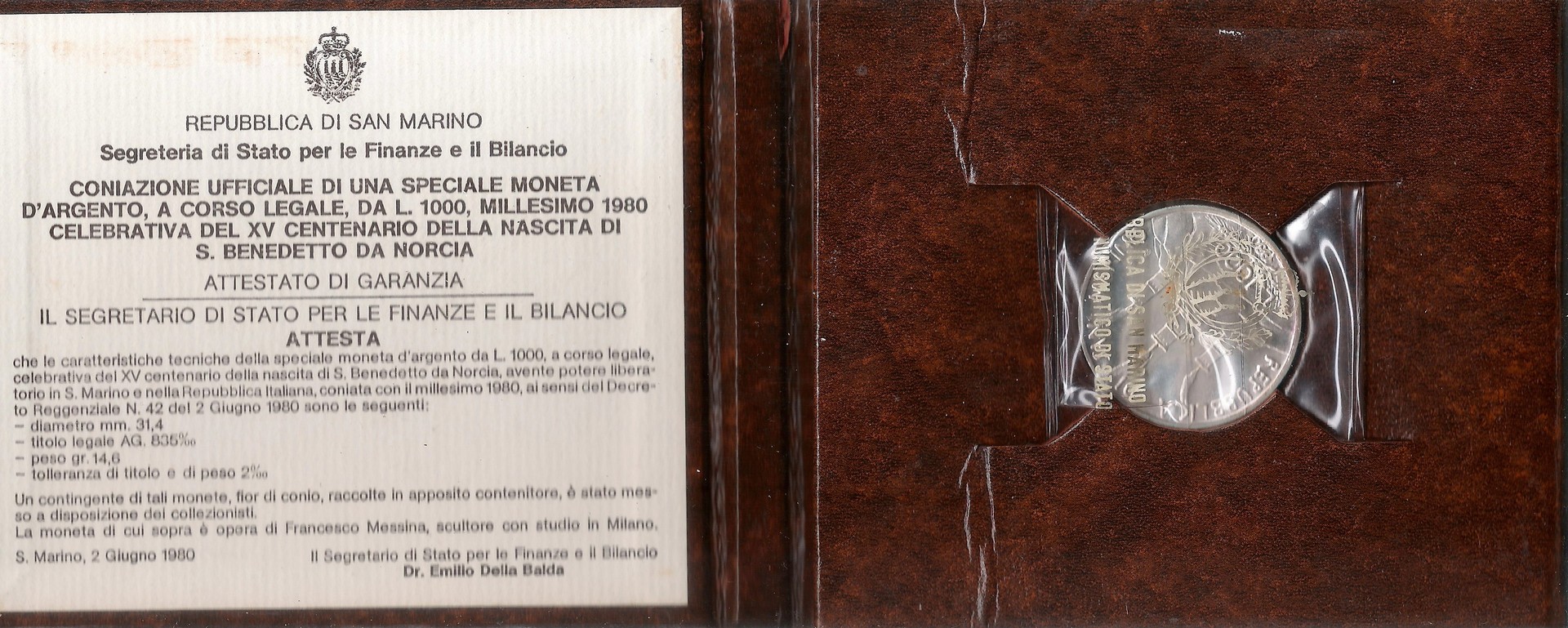 Coniazione ufficiale di una speciale moneta d'argento a corso legale da L.1000 millesimo 1980 celebrativa del XV centenario della nascita di S.Benedetto Da Norcia, 1980 Titolo legale argento 835% gr. 14,6 diametro mm. 31,4 Repubblica di San Marino Segreteria per le finanze e il Bilancio