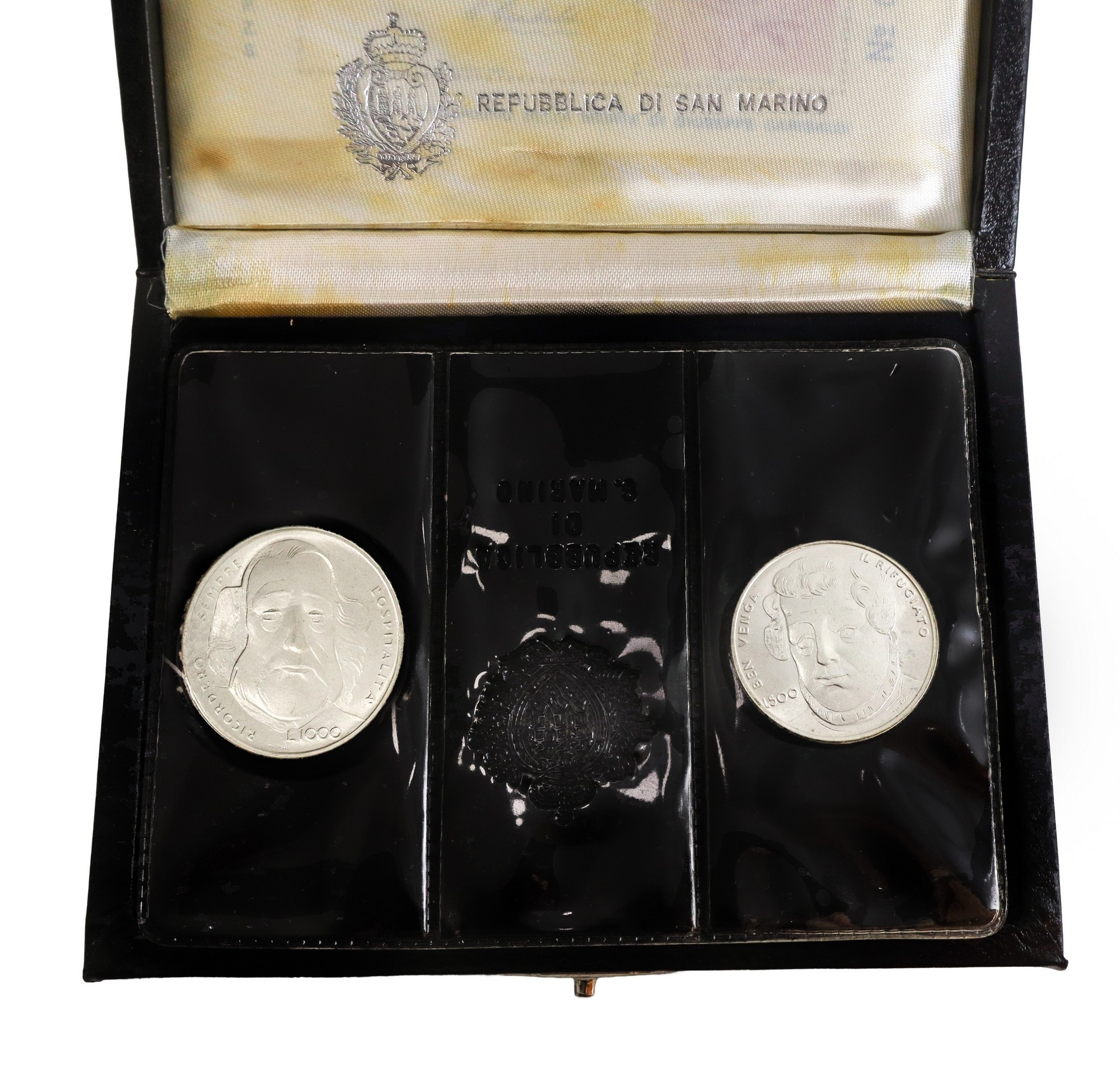 Dittico di monete d'argento a corso legale commemorative del 1° centenario della morte di Giuseppe Garibaldi, 1982 titolo legale argento 835% MONETA L.500: GR.11 diametro mm.29 MONETA L.1000: GR.14,6 diametro mm 31,4 Repubblica di San Marino Segreteria di Stato per le Finanze e il Bilancio