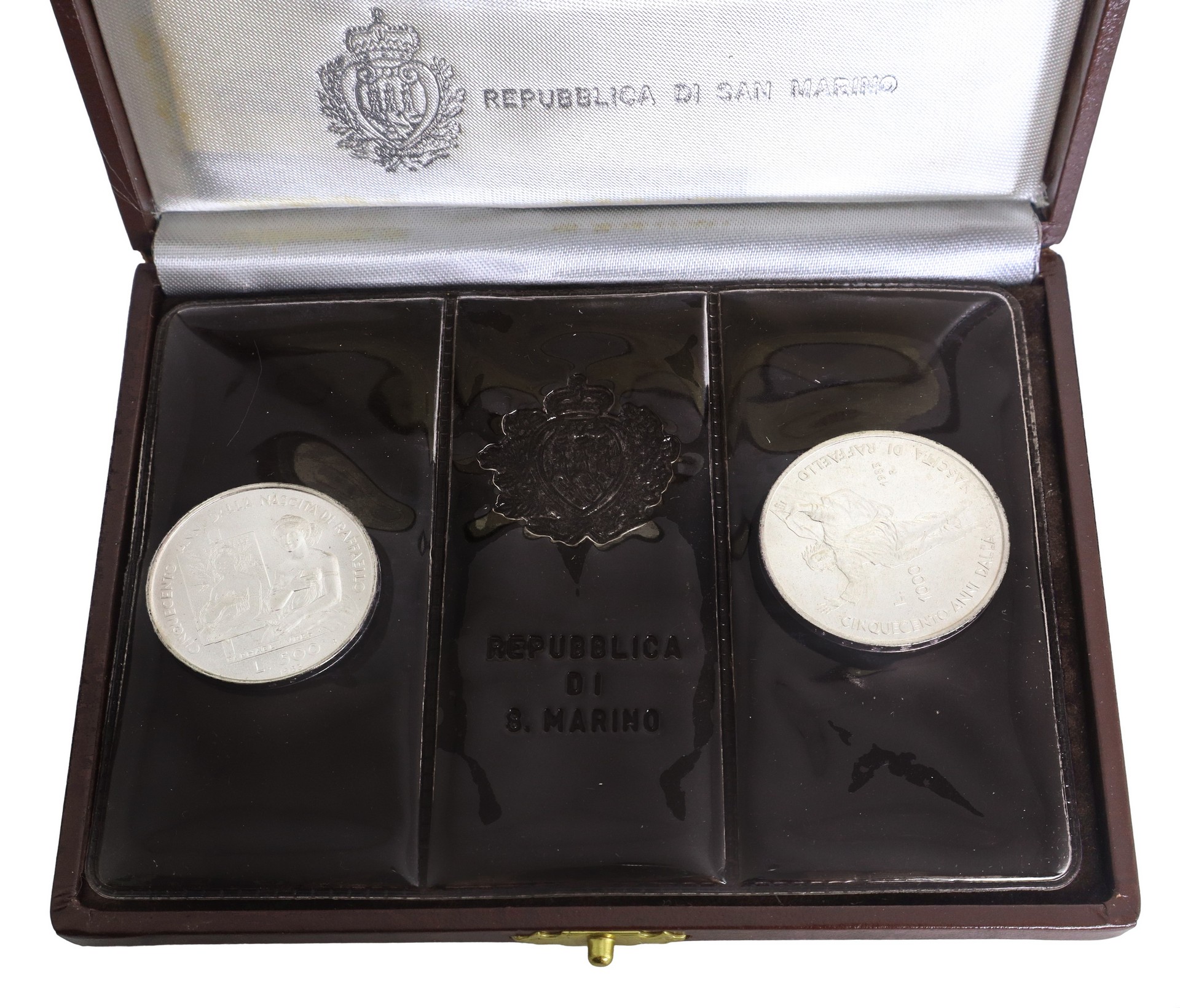 Dittico di monete d'argento a corso legale celebrative del V centenario della nascita di Raffaello Sanzio, 1983 titolo legale argento 835% MONETA L.500: GR.11 diametro mm.29 MONETA L.1000: GR.14,6 diametro mm 31,4 Repubblica di San Marino Segreteria di Stato per le Finanze e il Bilancio