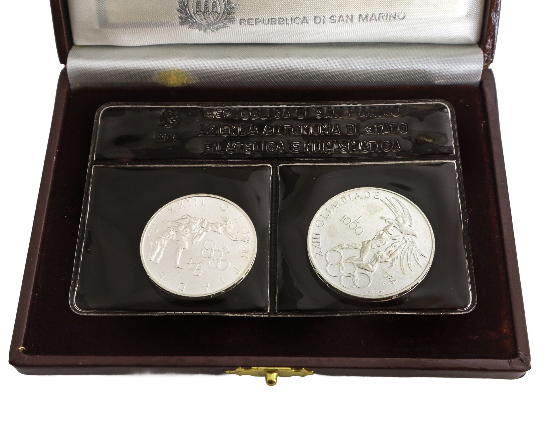 Dittico di monete d'argento in corso legale della XXIII olimpiade , 1984 Titolo legale argento 835% MONETA L.500: GR.11 diametro mm 29 MONETA L.1000: GR.14,6 diametro mm. 31,4 Repubblica di San Marino Segreteria di Stato per le finanze e il bilancio.