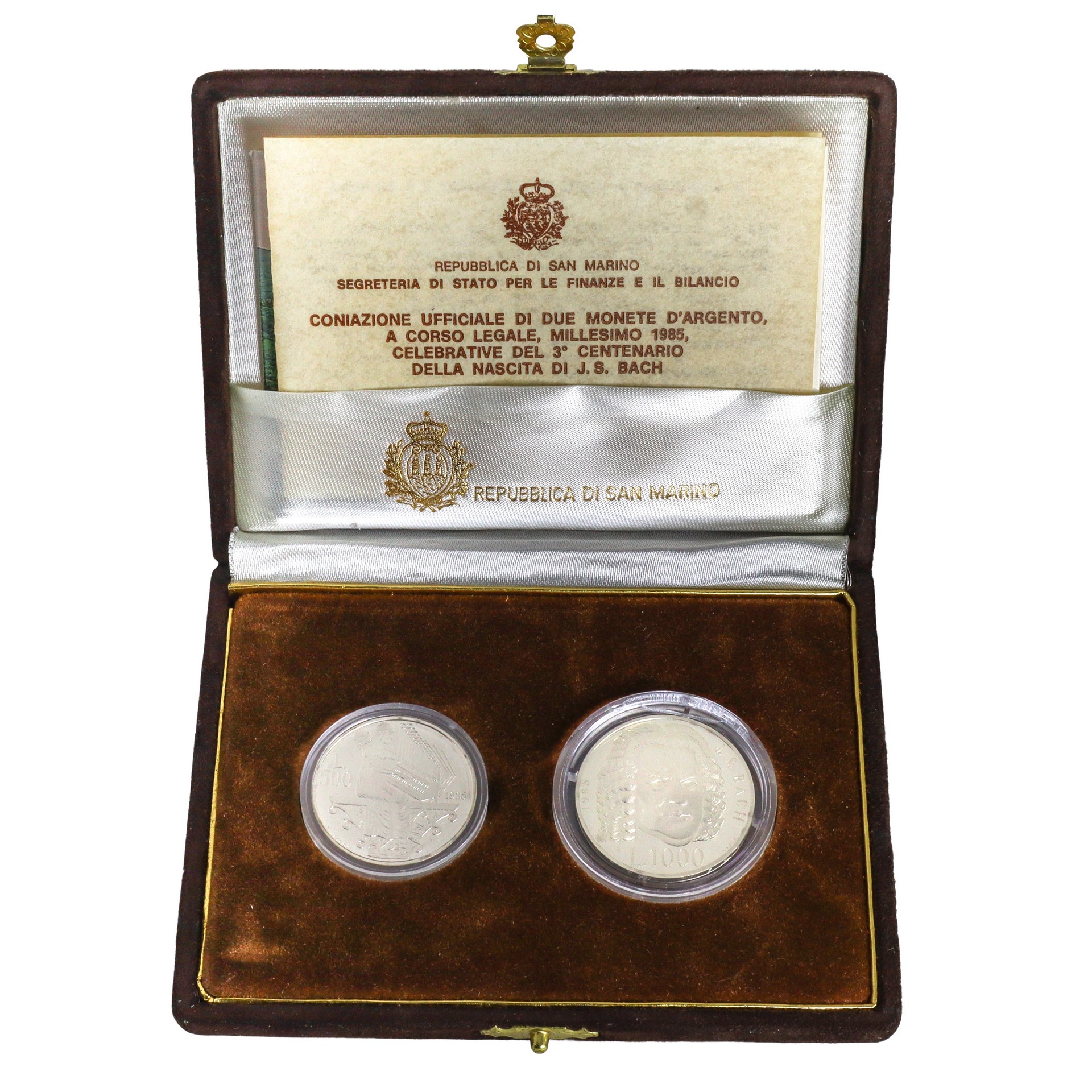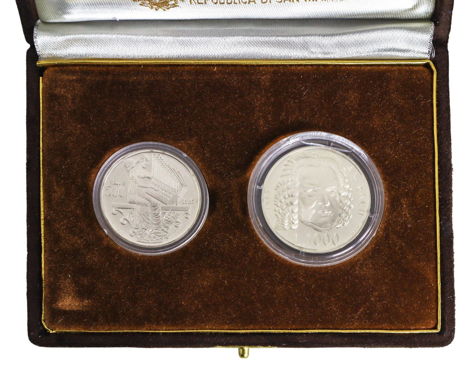 Dittico di monete d'argento a corso legale celebrative del III centenario della nascita di Johann Sebastian Bach, 1985 titolo legale argento 835% MONETA L.500: GR.11 diametro mm.29 MONETA L.1000: GR.14,6 diametro mm 31,4 Repubblica di San Marino Segreteria di Stato per le Finanze e il Bilancio