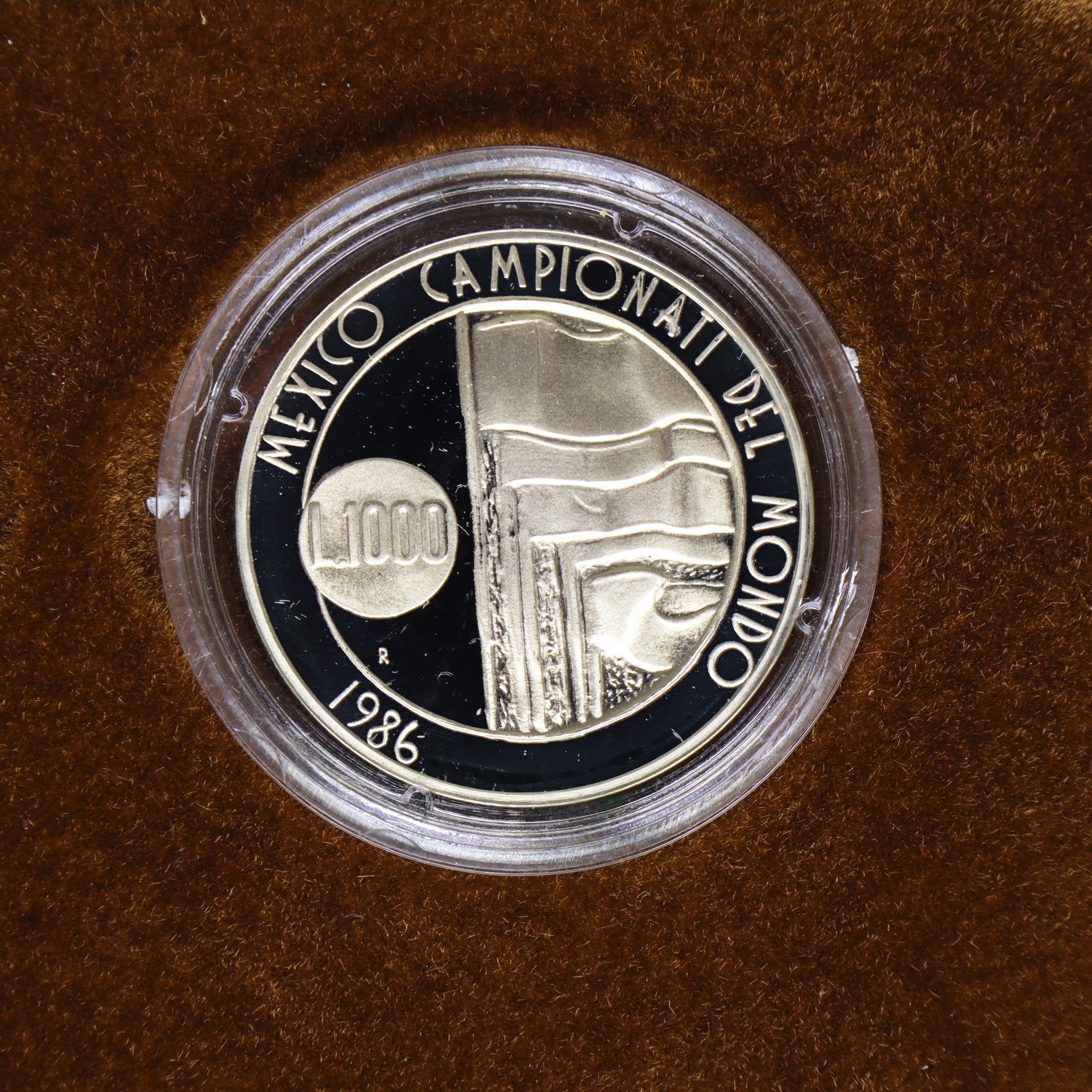 VERSO MONETA L.1000: mexico campionati del mondo 1986 L.1000 e un gruppo di bandiere.