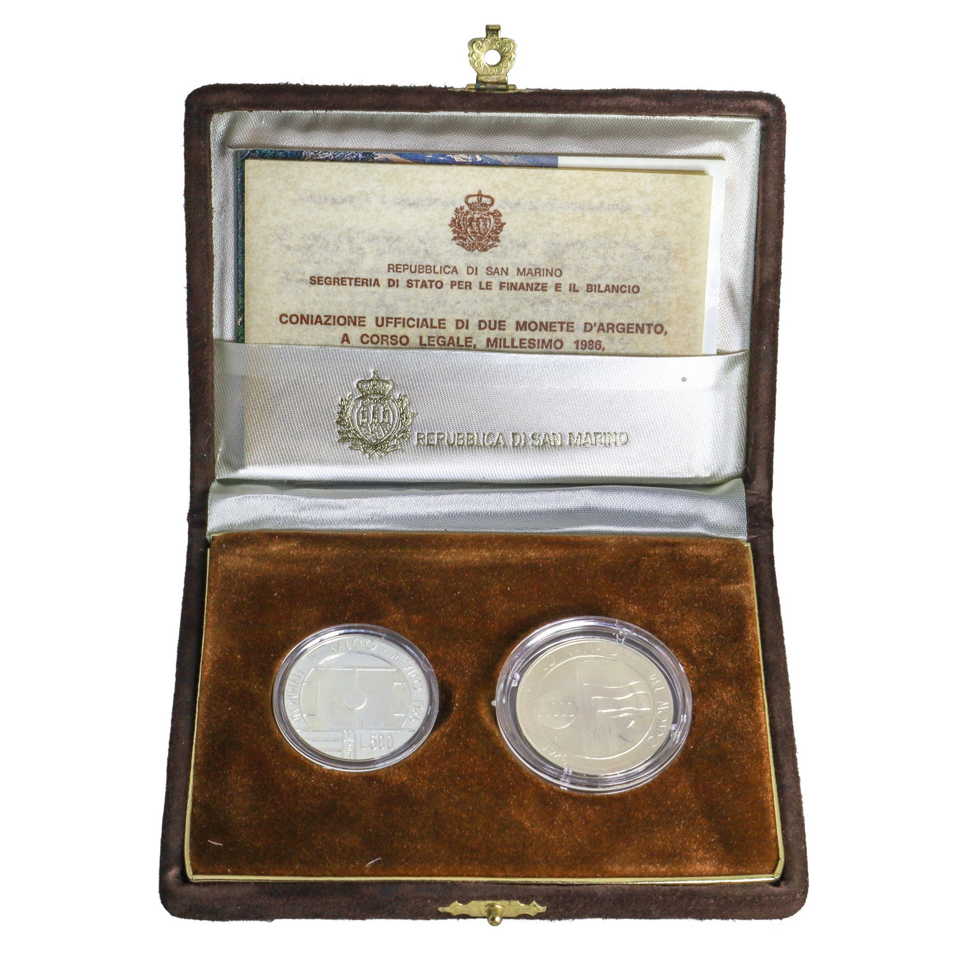 Dittico di monete d'Argento a corso legale celebrative dei campionati mondiali di calcio, 1986 titolo legale argento 835% MONETA L.500: GR.11 diametro mm.29 MONETA L.1000: GR.14,6 diametro mm 31,4 Repubblica di San Marino Segreteria di Stato per le Finanze e il bilancio