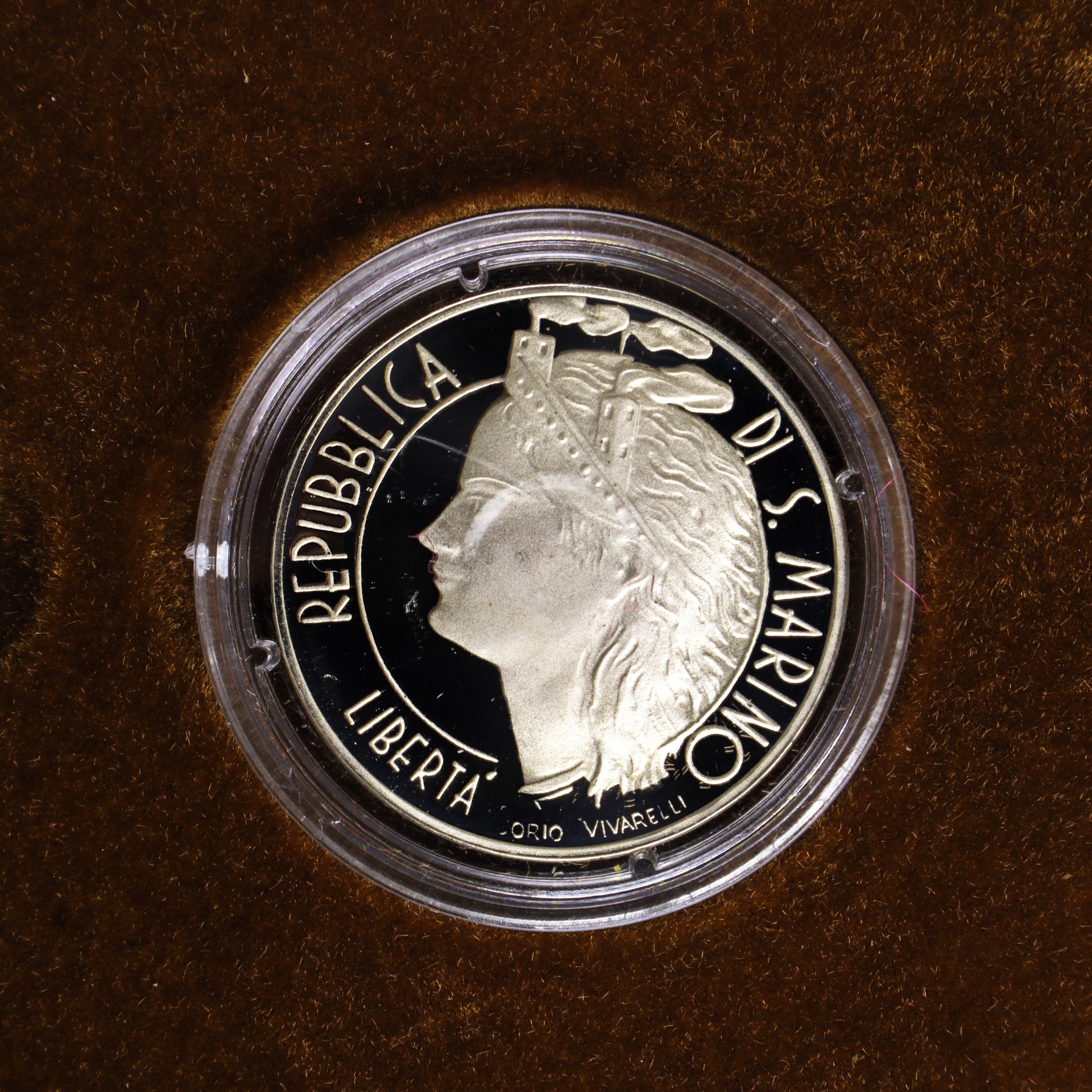 Recto delle monete: Figura femminile di profilo con le tre torri stilizzate e la scritta "REPUBBLICA DI SAN MARINO" "LIBERTA'" ed il nome dell'autore del bozzetto.
