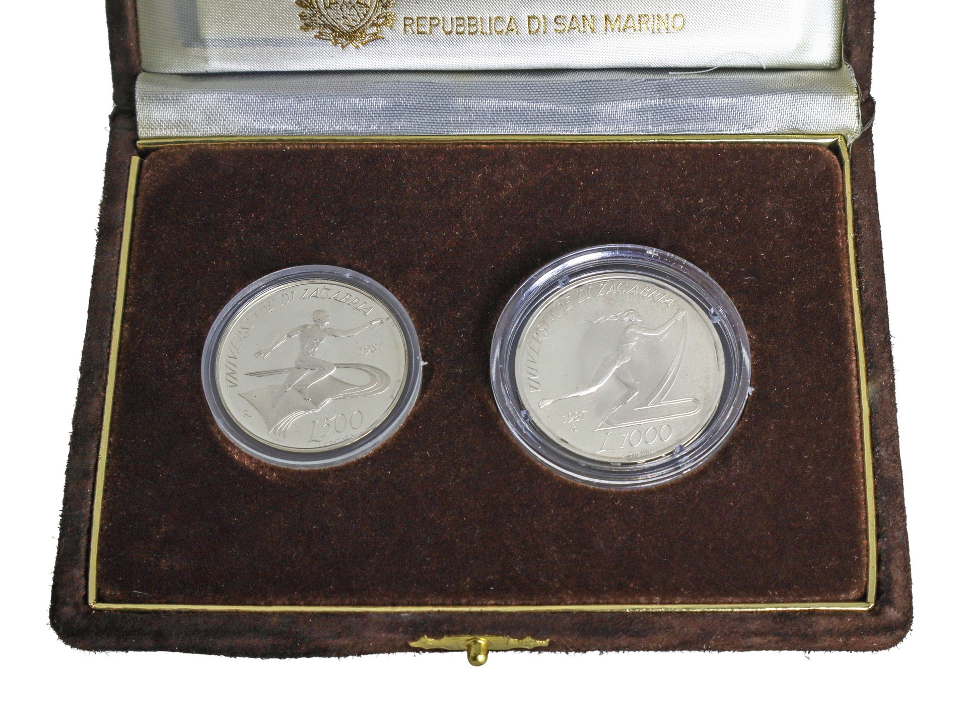 Dittico di monete d'argento a corso legale celebrative delle Universiadi di Zagabria, 1987 titolo legale argento 835% MONETA L.500: GR.11 diametro mm.29 MONETA L.1000: GR.14,6 diametro mm 31,4 Repubblica di San Marino Segreteria di Stato per le Finanze e il Bilancio