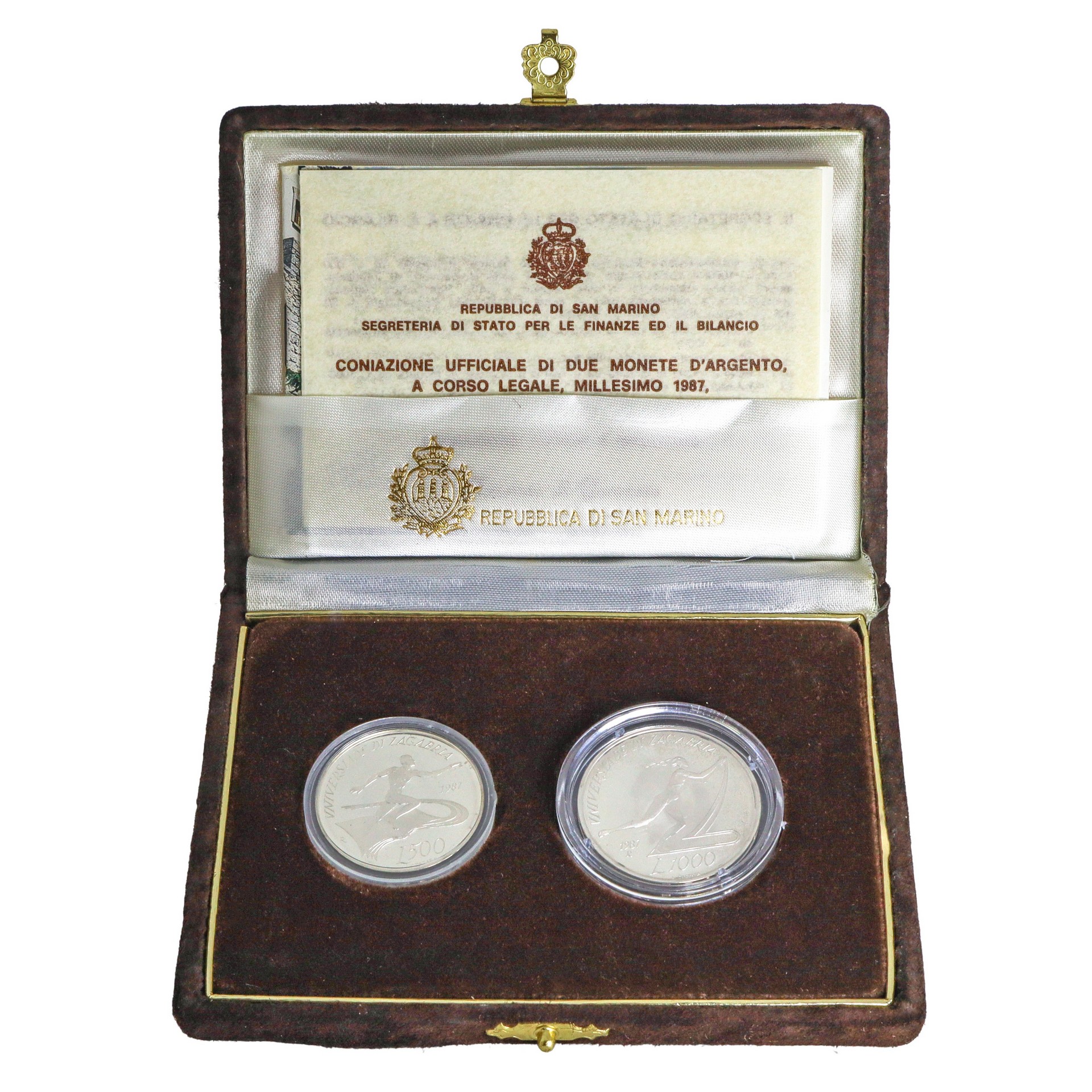 Dittico di monete d'argento a corso legale celebrative delle Universiadi di Zagabria, 1987 titolo legale argento 835% MONETA L.500: GR.11 diametro mm.29 MONETA L.1000: GR.14,6 diametro mm 31,4 Repubblica di San Marino Segreteria di Stato per le Finanze e il Bilancio