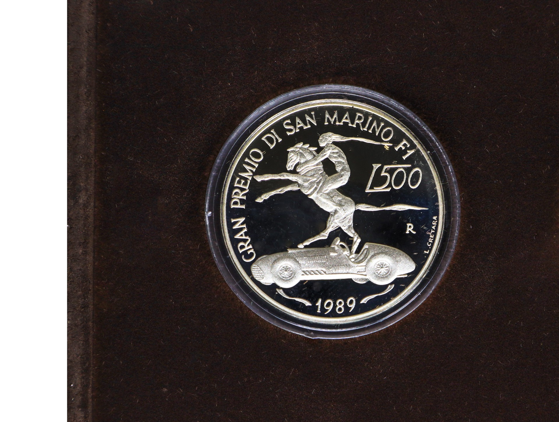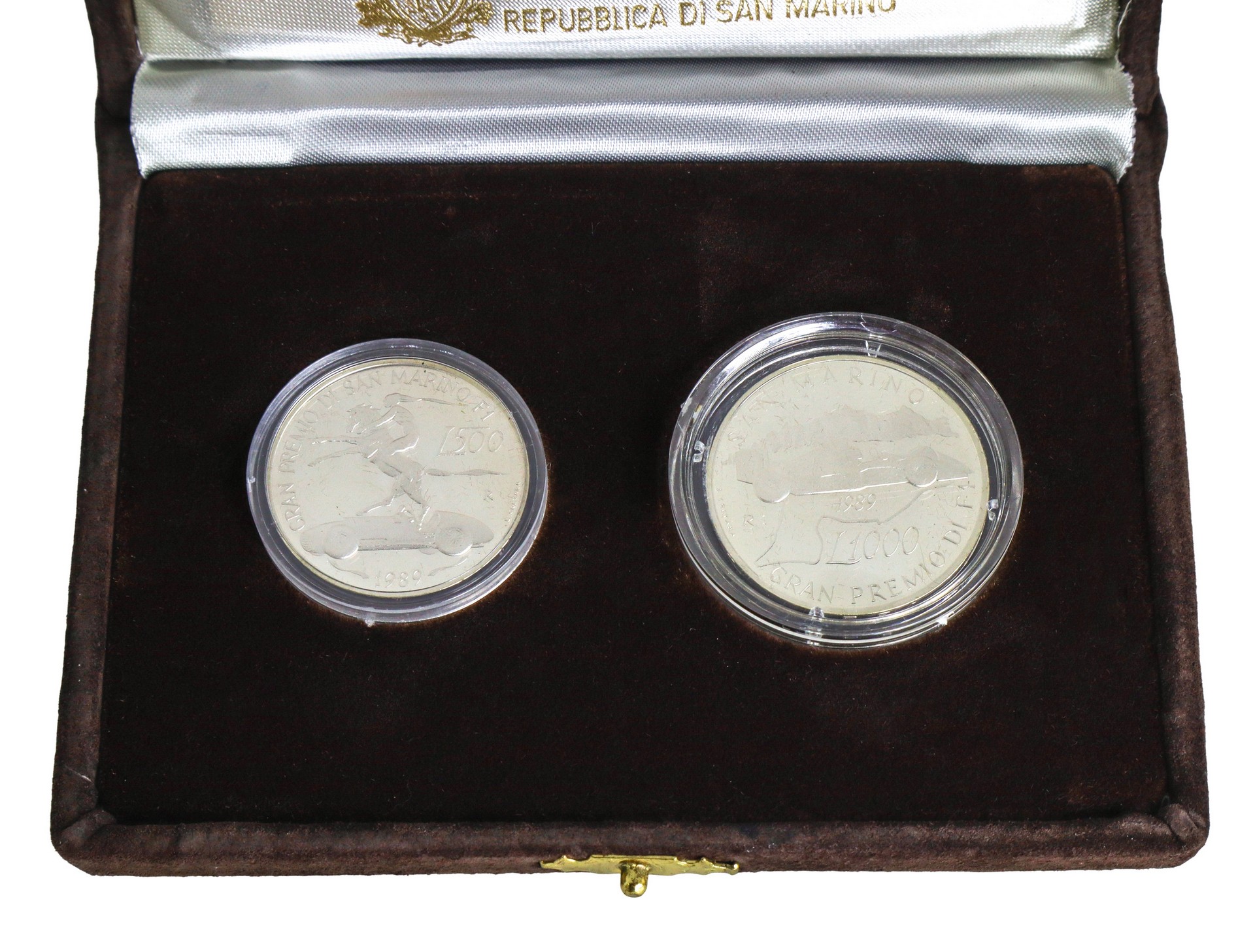 Dittico di monete d'argento a corso legale celebrative del Gran Premio San Marino di Formula Uno, 1989