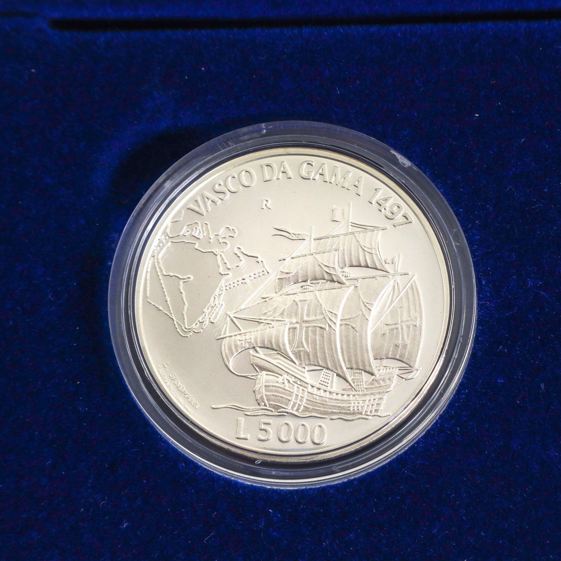 VERSO MONETA L.5000: La nave di Vasco da Gama con accanto la rotta del viaggio e sopra la scritta VASCO DA GAMA 1497 L.5000 L.SANDMANN (autore del bozzetto)