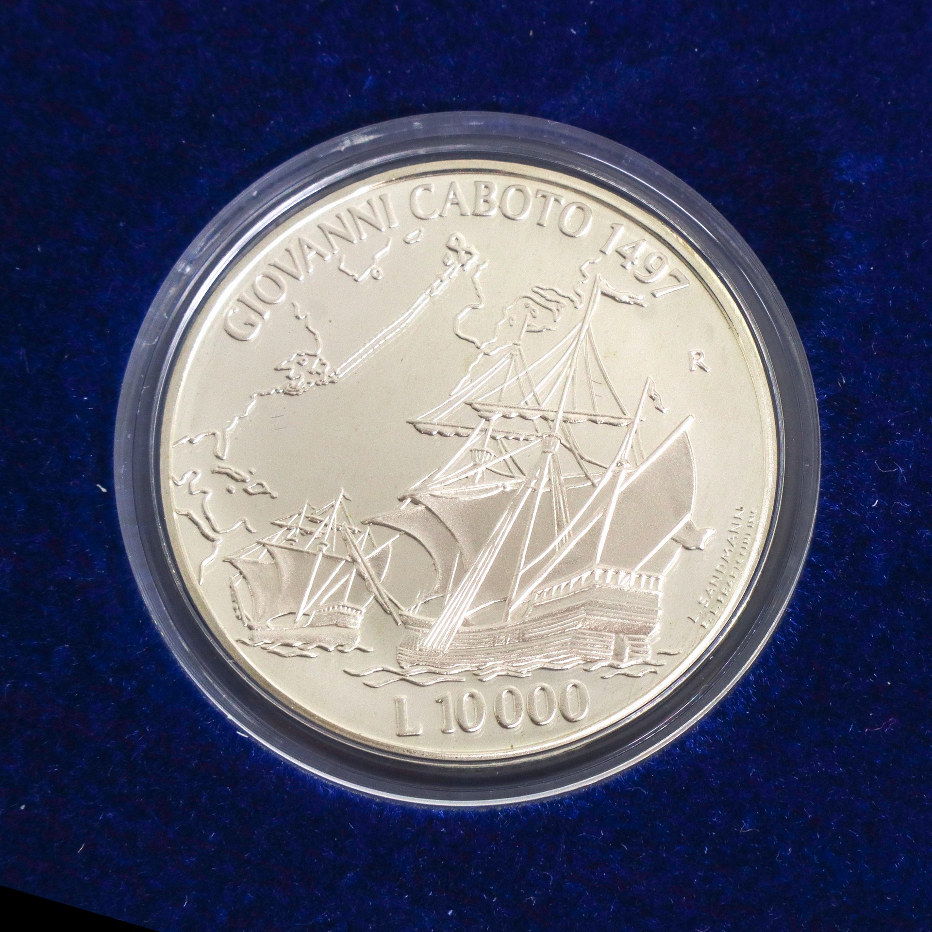 VERSO MONETA L.10000: Nave di Giovanni Caboto con la rotta del suo viaggio e la legenda GIOVANNI CABOTO 1497 L.10000, L.SANDMANN (autore del bozzetto)